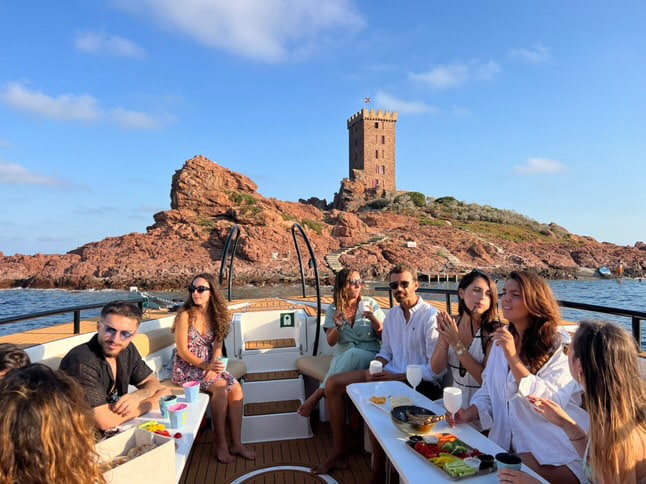 Embarquer sur notre navire amiral pour un apéritif au soleil couchant dans les roches rouges de l’Estérel.
